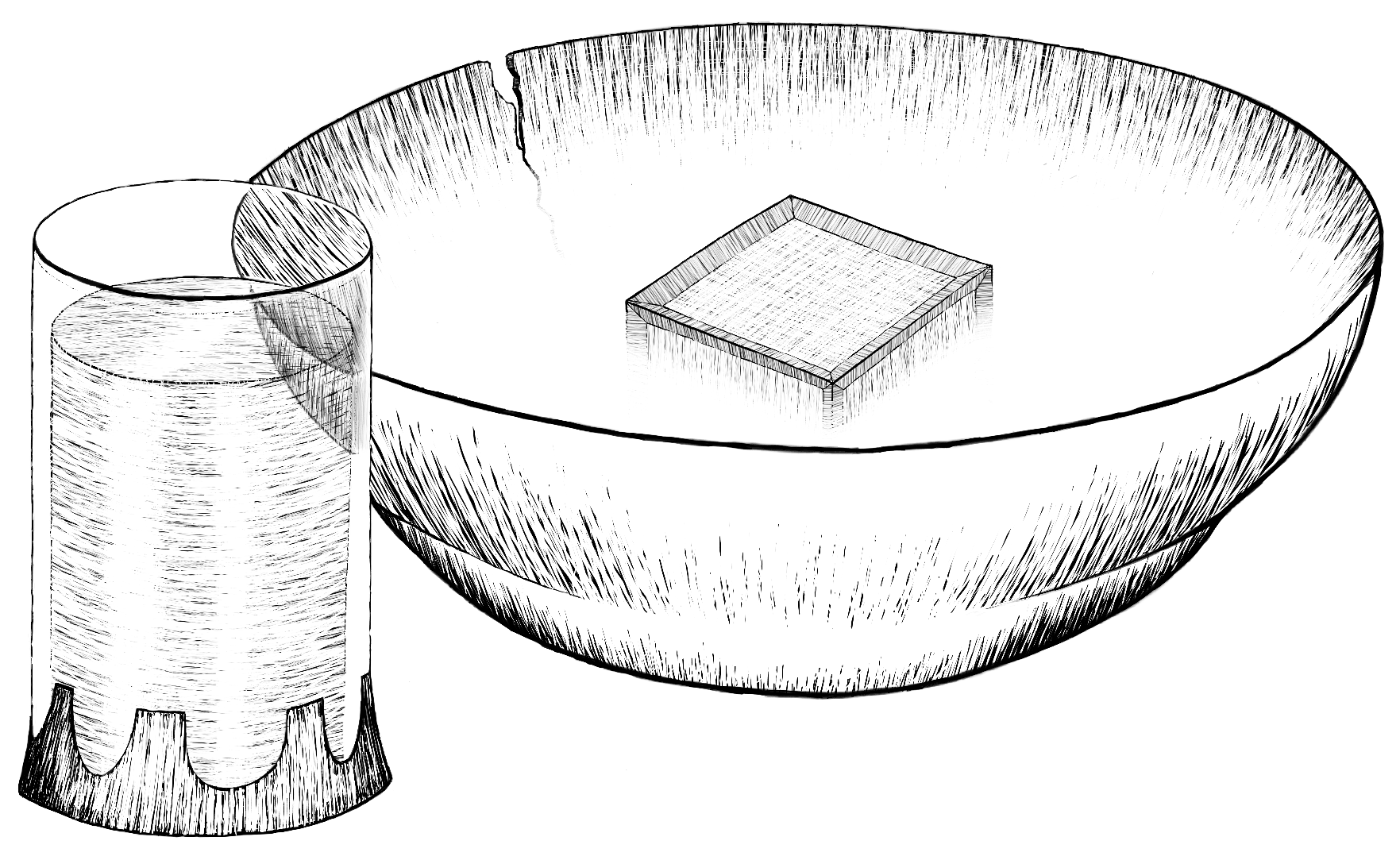 I glanced at a few pictures of bowls and old glasses, but this is mostly just from my head. I'm not too happy with how the "liquor" looks in the glass. I'd also like to have a better way of suggesting the white vapor. I do like the refraction of the bowl's corner in the glass, and the way the cube vanishes.